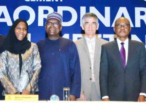 Photo:Acting Company Secretary, Dangote Cement Plc, Edward Imoedemhe; Independent Non-Executive Director, Dangote Cement Plc, Ernest Ebi; Non-Executive Director, Dangote Cement Plc, Abdu Dantata; Non-Executive Director, Dangote Cement Plc, Halima Aliko-Dangote; Chairman, Dangote Cement Plc, Aliko Dangote; Group Managing Director, Dangote Cement Plc, Michel Puchercos; Non-Executive Director, Dangote Cement Plc, Olakunle Alake; Non-Executive Director, Dangote Cement Plc, Dorothy Ufot, SAN; and Deputy Group Managing Director, Dangote Cement Plc, Philip Mathew, at the Extraordinary General Meeting of Dangote Cement Plc